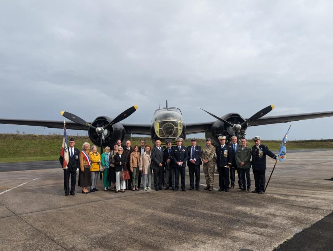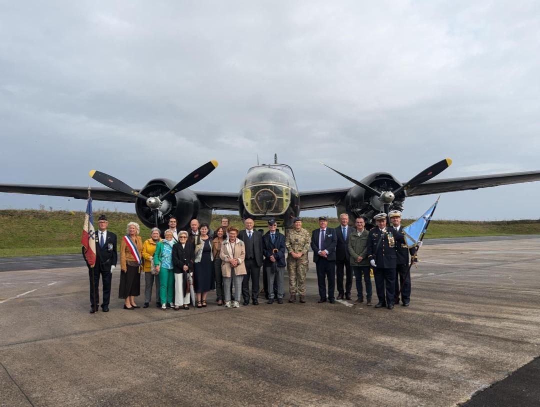 Les membres de l'AAAGL présents avec leur fanion et le général Sabene, commandant en second le commandement territorial de l'armée de l'Air et de l'Espace, la commandante Katherine Ingram, représentant la Royal Air Force.