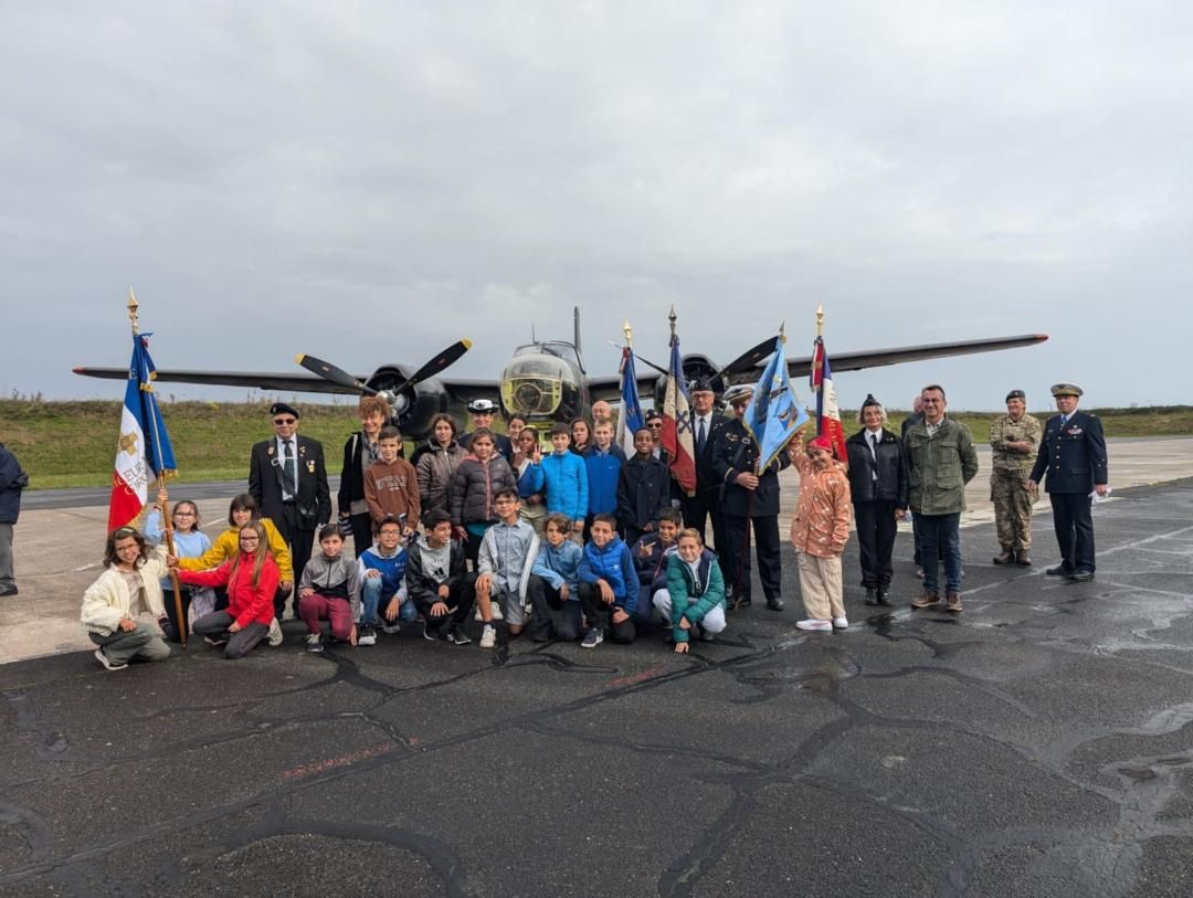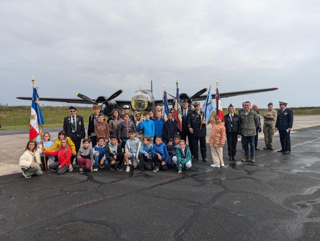 La maire-adjointe et les membres de l'AAAGL avec le colonel Picot, commandant la base et des écoliers de Mérignac invités pour la circonstance.